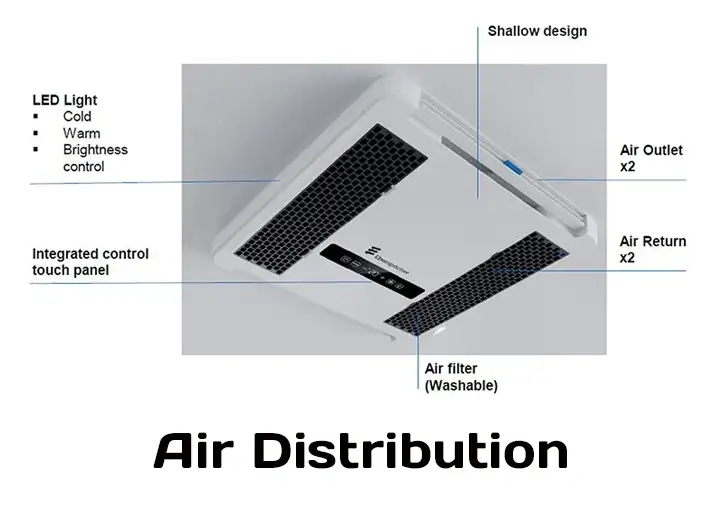 The system features a low-profile interior air distribution panel measuring 1.8″, designed to maximize headroom while delivering even airflow throughout the cabin. Integrated dimmable LED lighting within the air distribution box enhances interior ambiance. The outside roof top A/C is ultra-low profile at just 9.8″ tall.